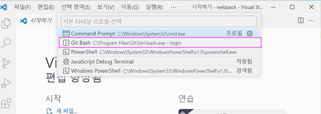 - 화면 상단 명령팔레트에 표시된 목록 중에서 [Git Bash] 을 선택 하여 기본 터미널 프로필을 변경